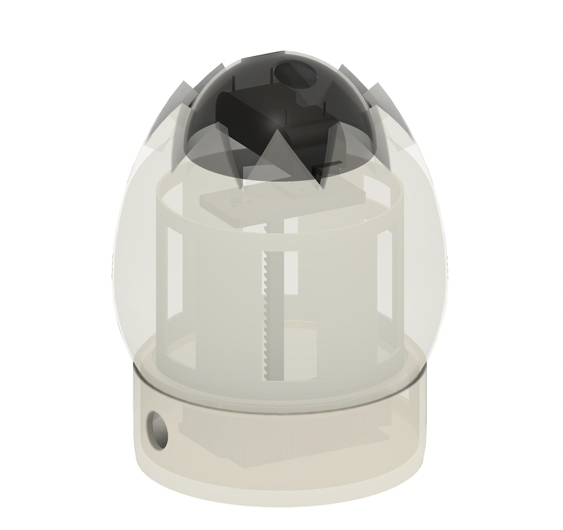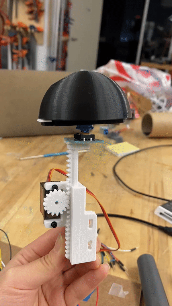 When this speed is above a certain threshold, Critter senses danger and shrinks into its shell. This movement is enabled by a rotating motor which, with the help of a few 3D printed attachments, turns into a linear actuator.