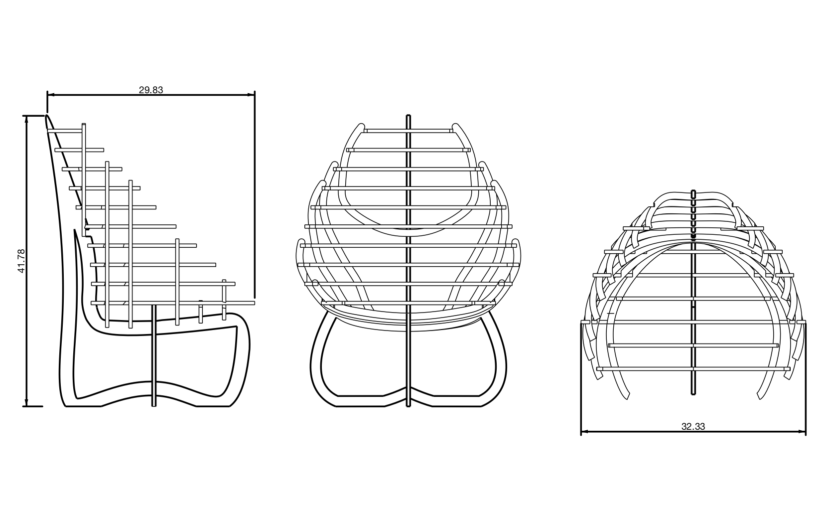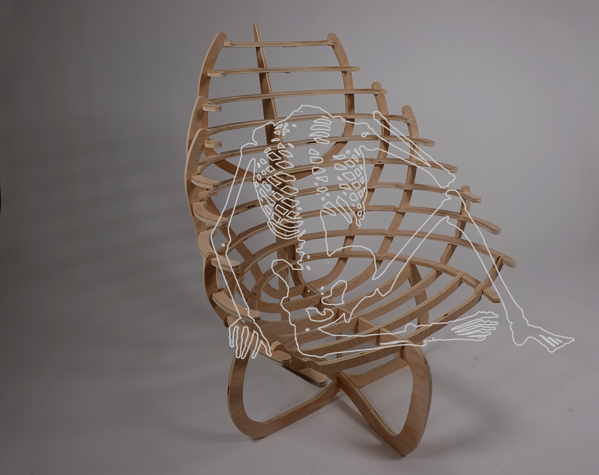 To evoke a feeling of support, the design of this chair is inspired by the most fundamental support structure of our bodies - the skeletal system. From the horizontal pieces that surround you as a ribcage surrounds and protects the lungs and heart, to the large vertical piece that connects the rest like a spine, the components resemble the human skeleton not just in appearance but in function. At the same time, the brittle individual pieces divulge its fragility and suggest the possiblity of breaking at any moment.