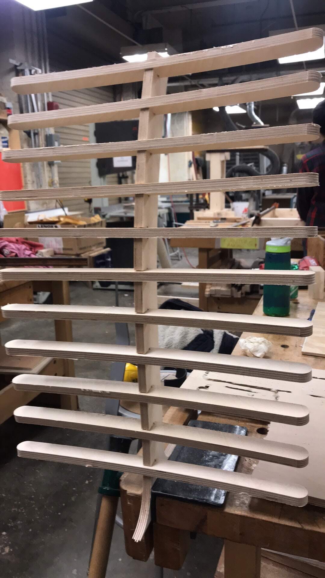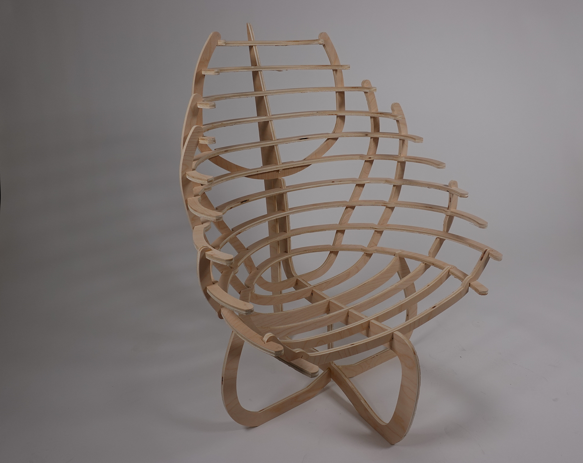 The pieces of this chair are cut using a CNC router, which automates the cutting process. This allowed me to quickly make a full-scale prototype of the spine of the chair, to see how the pieces fit together when fully scaled and test out the curvature, which was modeled on the lumbar support of ergonomic chairs.