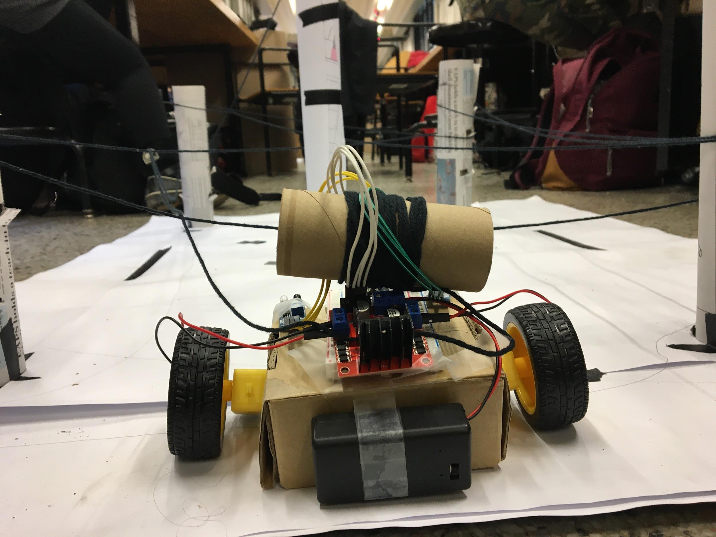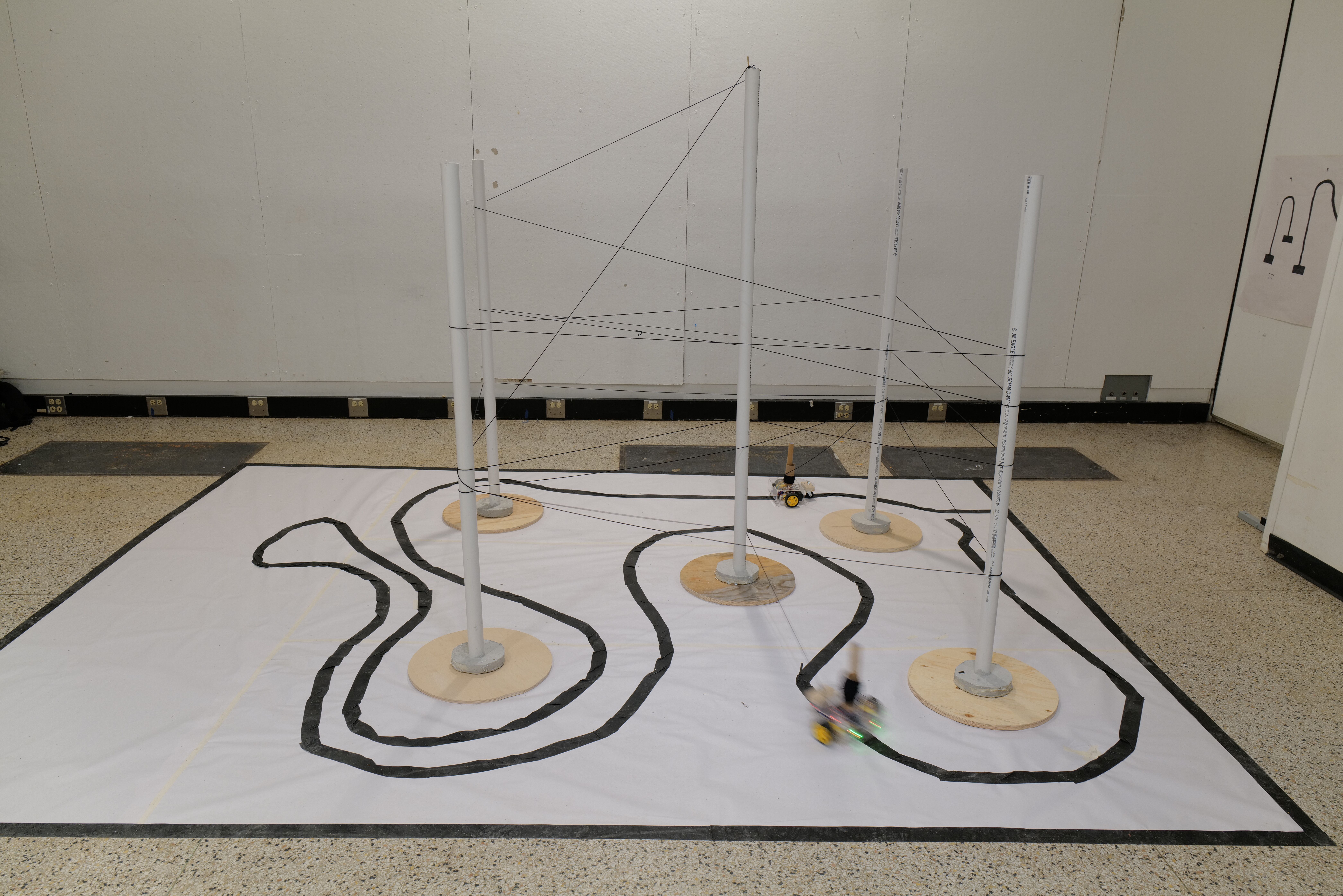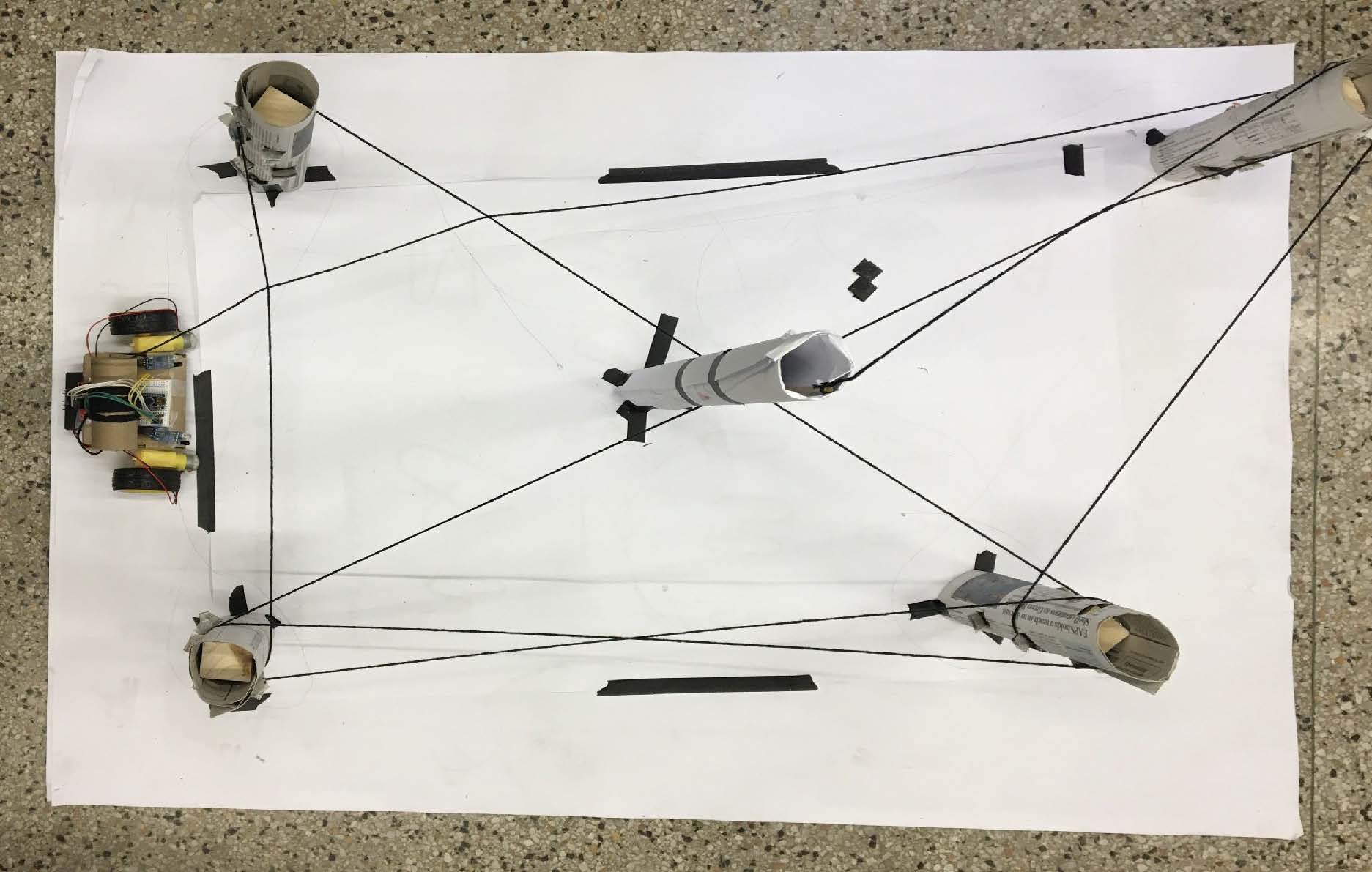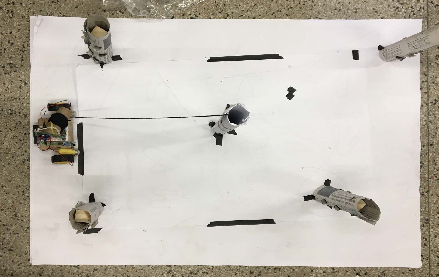 Our early prototypes used rolled up newspapers as the poles and a taped-together robot with a cardboard box as its body. We tested various arrangements of poles and found that configurations with one central pole yieled the best results, especially when the strings were attached to the top like a maypole.