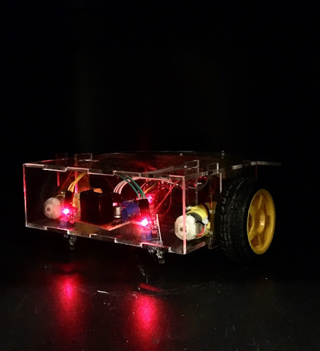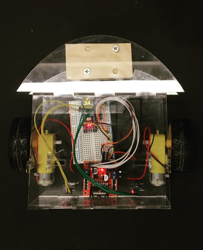 Our robots use two infrared sensors to detect the contrast on the ground caused by the black tape on white paper, and is programmed to adjust the left and right wheel motors such that it stays on track. As long as it detects the line, its LED "eyes" will glow green; however, when the line is missing, the lights turn and remain red until it gets directed back onto the course. Rather than hide the internal configuration, which still had a rough appearance with wires and breadboard galore, we decided to showcase it by making the final chassis out of plexiglass.