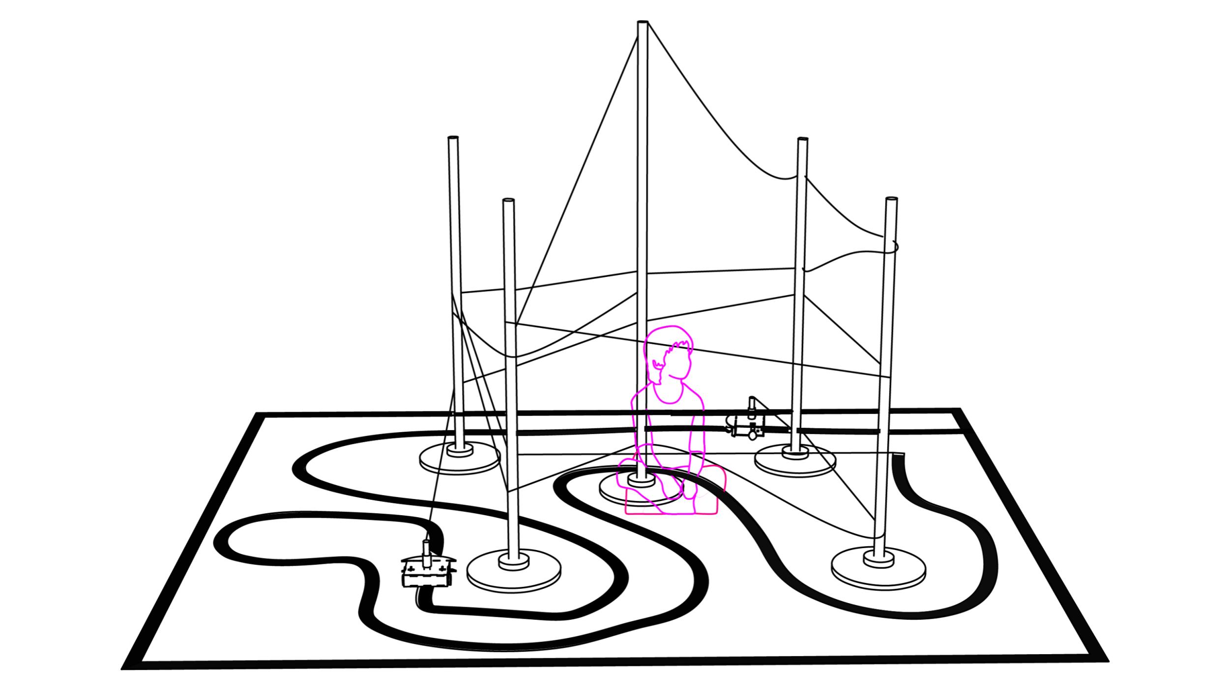 String-pulling robots weave through poles following lines that have been laid down by a human interactor. Over time, the strings that they leave behind intertwine like a 3D spider web, creating an enclosure that cannot be made with just humans nor with just robots, rendering one useless without the other. This is the premise of Web, an installation exploring human-robot collaboration.